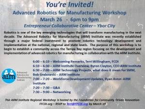 On March 26, the Foundation for Community Driven Innovation (FCDI) is hosting a free Regional Workshop with the Advanced Robotics for Manufacturing (ARM) Institute at the Hillsborough County Entrepreneur Collaborative Center at in Ybor City. The purpose of this workshop is to begin to establish a community across the Tampa Bay region focusing on the development and implementation of advanced robotics for manufacturing in collaboration with the ARM Institute.