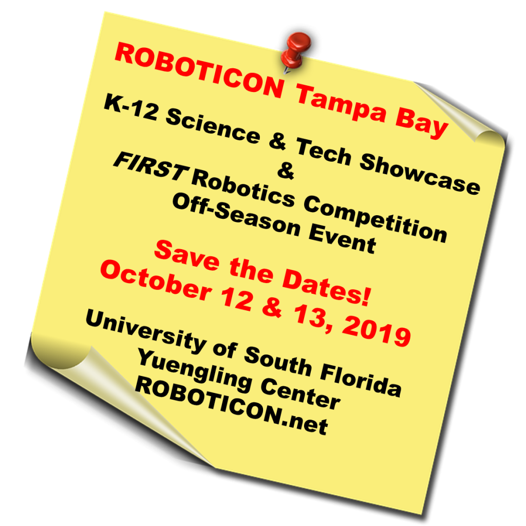 We’ve also got ROBOTICON 2019 on the calendar for October 12 & 13 at the University of South Florida Yuengling Center, where the AMRoC FIRST Robotics Competition field will be front and center as teams from around Florida compete in Destination:Deep Space one more time!  Registration for teams and free public tickets will go online soon, so stay tuned to the website and related social media.